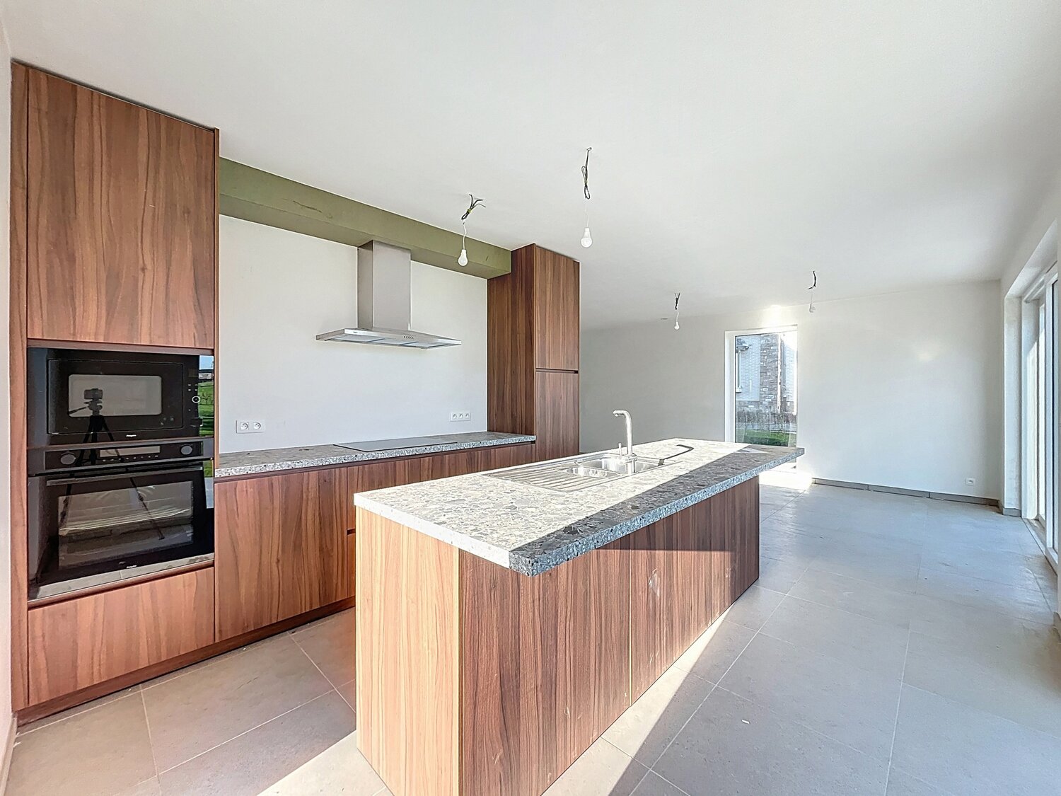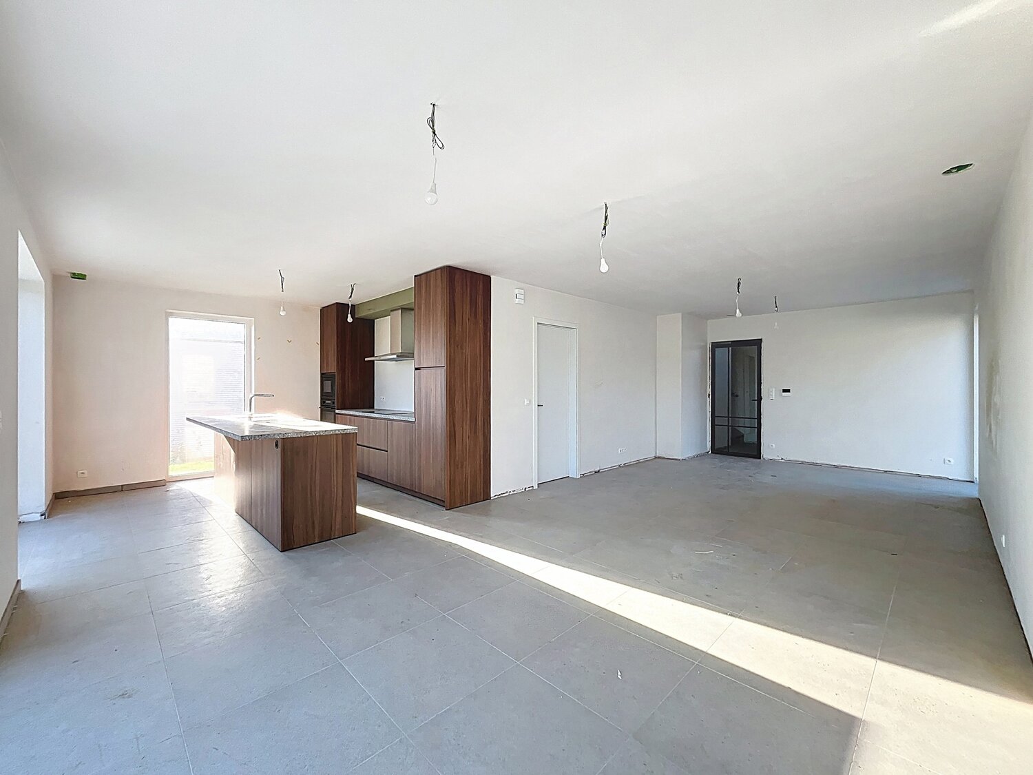 Vous trouverez ensuite le salon avec une cuisine ouverte moderne équipée d'un îlot central.