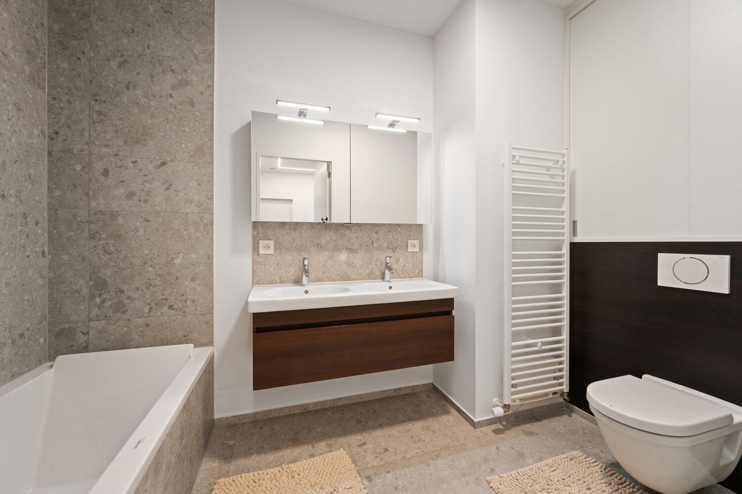 Indeling: inkomhal met afzonderlijk toilet, technische berging met waterverzachter, master bedroom met badkamer (ligbad, dubbele lavabo, toilet), twee slaapkamers en tweede badkamer met inloopdouche. De lichtrijke leefruimte met ingebouwde bureauhoek sluit via de open keuken aan op het zonnige terras met prachtig parkzicht.
