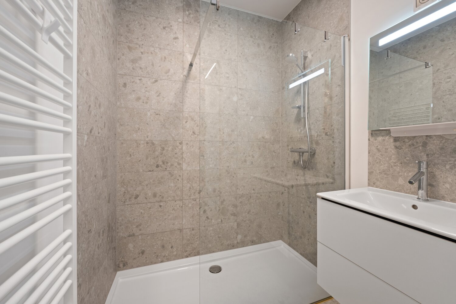 Het appartement is volledig instapklaar en afgewerkt met duurzame materialen. De volkeramische tegelvloer loopt door in alle ruimtes en zorgt voor een stijlvolle, onderhoudsvriendelijke uitstraling. Dankzij de vloerverwarming met afzonderlijke temperatuurregeling per slaapkamer geniet je van optimaal comfort het hele jaar door.