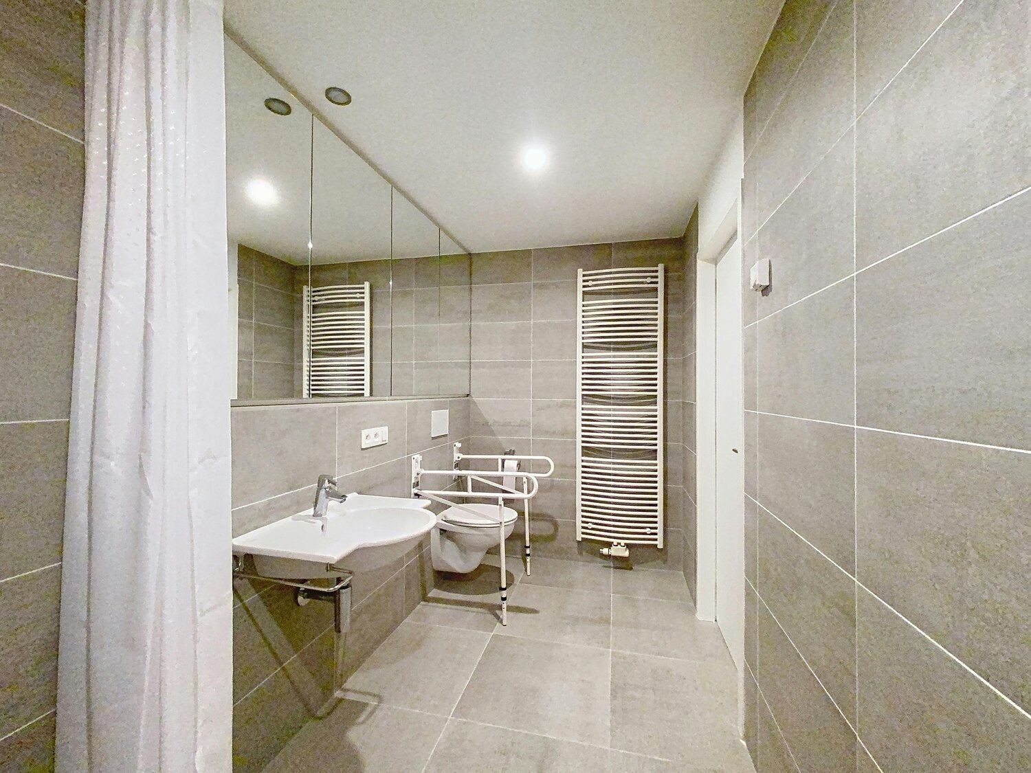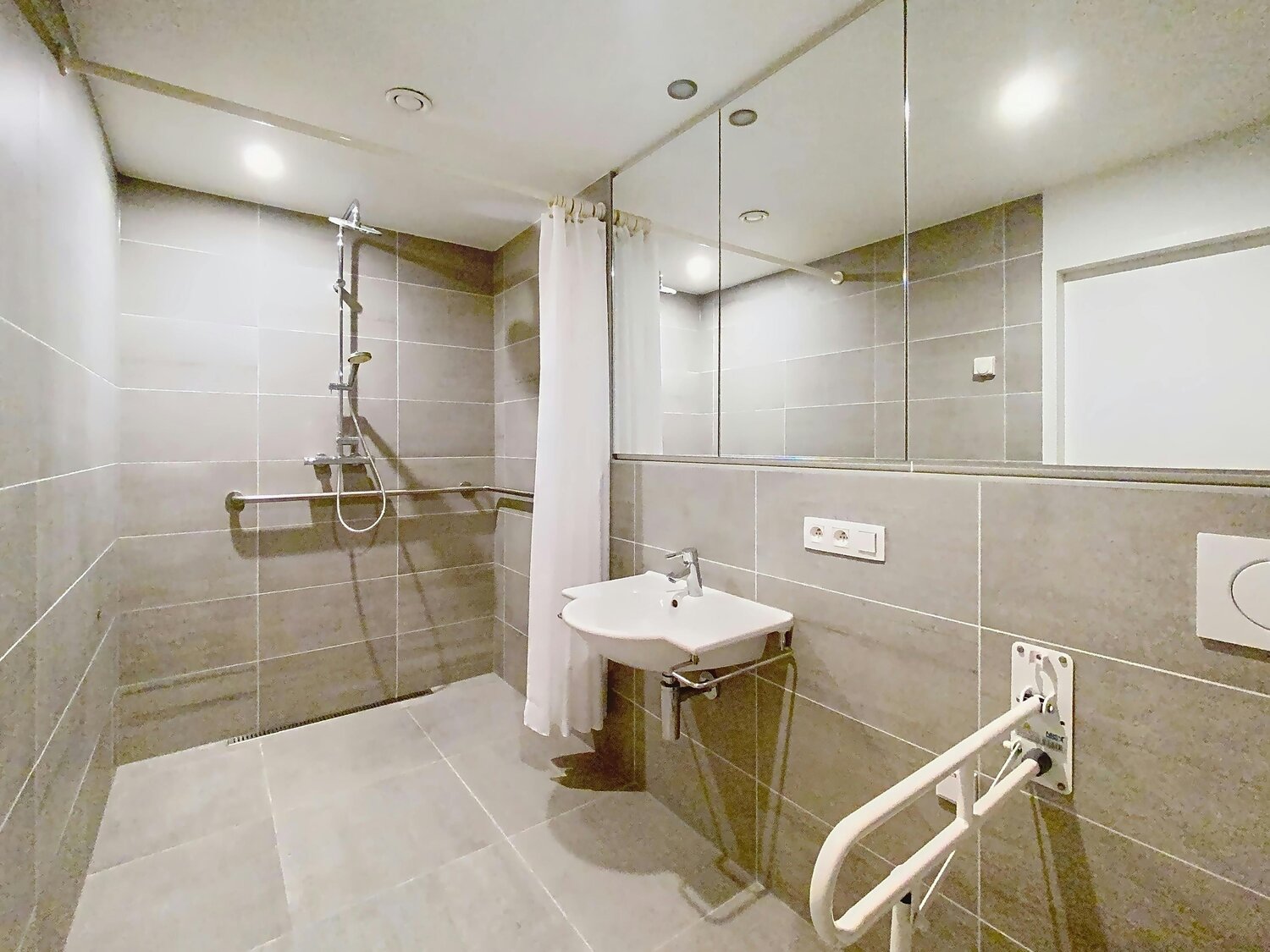 La chambre offre un accès direct à la salle de bain avec douche à l'italienne et lavabo, toutes conçues dans un souci de confort et d'accessibilité. La disposition et la finition rendent cet appartement idéal pour ceux qui apprécient le confort et une expérience de vie sans soucis.
