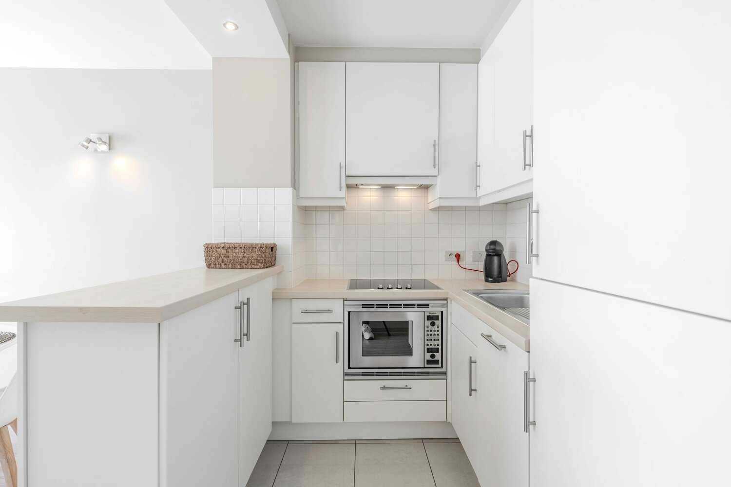 - cuisine avec raccordement pour lave-linge, évier, plaque à induction AEG, four combiné AEG et réfrigérateur avec congélateur
