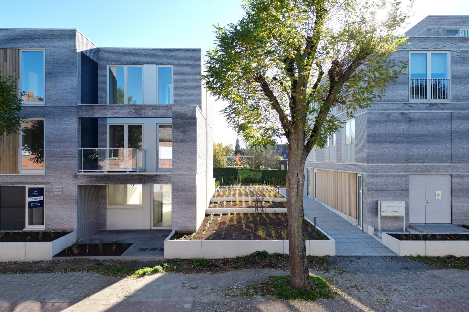 Deze koppelwoning van 180 m² bestaat uit drie bouwlagen met op het gelijkvloers een inkomhal met gastentoilet uitkomende in de woonkamer met open keuken en berging. Via de grote schuiframen kom je op het zuidgerichte zonneterras van 17 m² met aansluitend de tuin van 79m² . Op de eerste verdieping zijn er 2 slaapkamers, een badkamer met douche en dubbele lavabo en een afzonderlijk toilet. Op de tweede verdieping is er een wasberging, 2 slaapkamers en een badkamer met douche, lavabo en toilet. Achteraan de privatieve tuin bevindt zich een afgesloten, gemeenschappelijke tuin waar de kinderen veilig kunnen spelen.