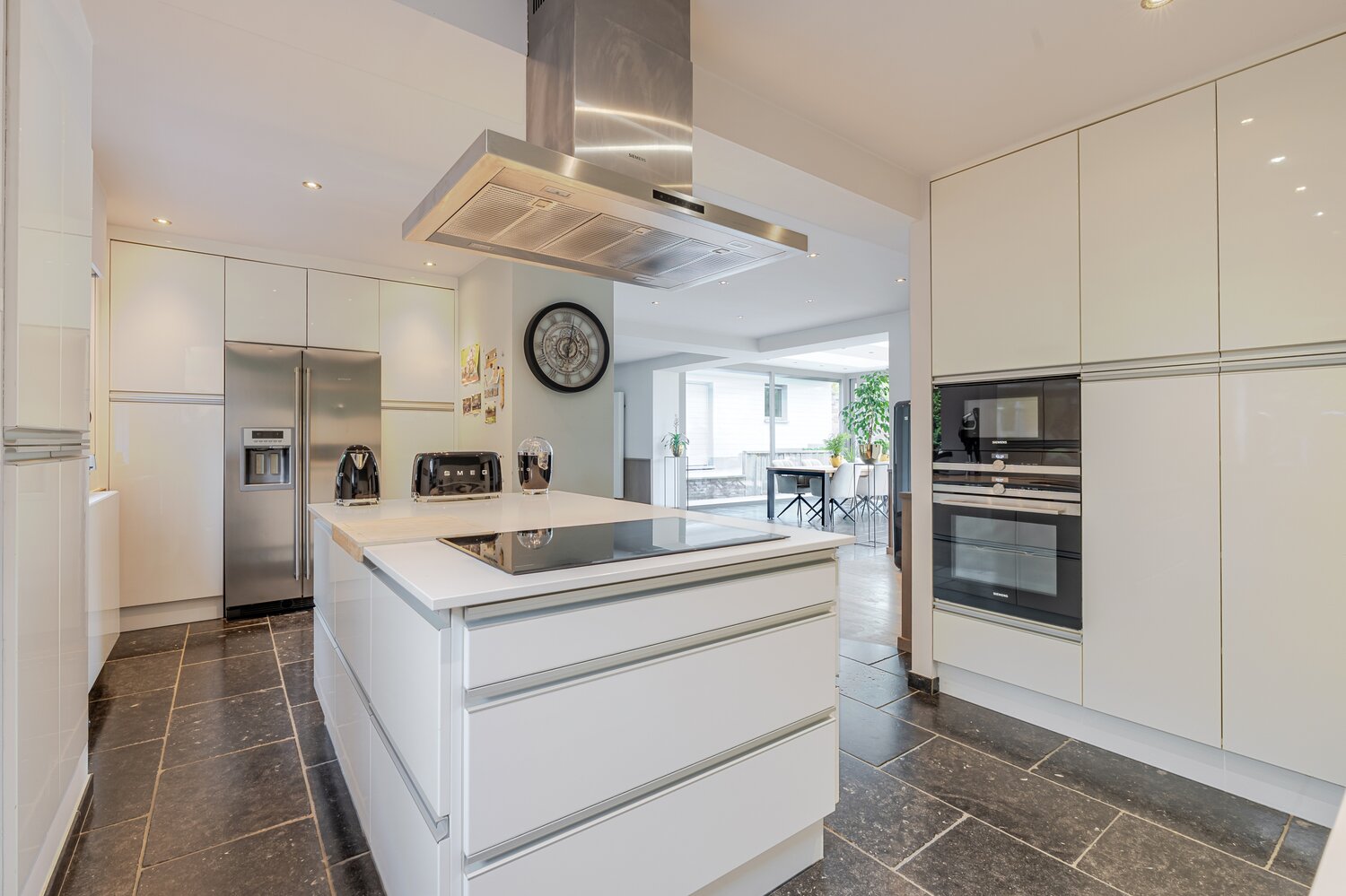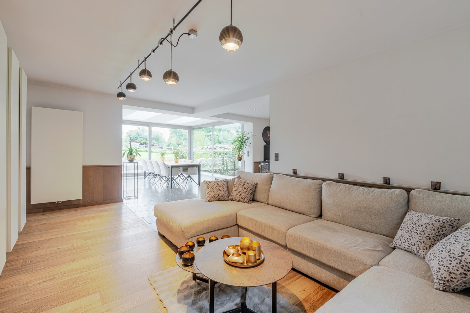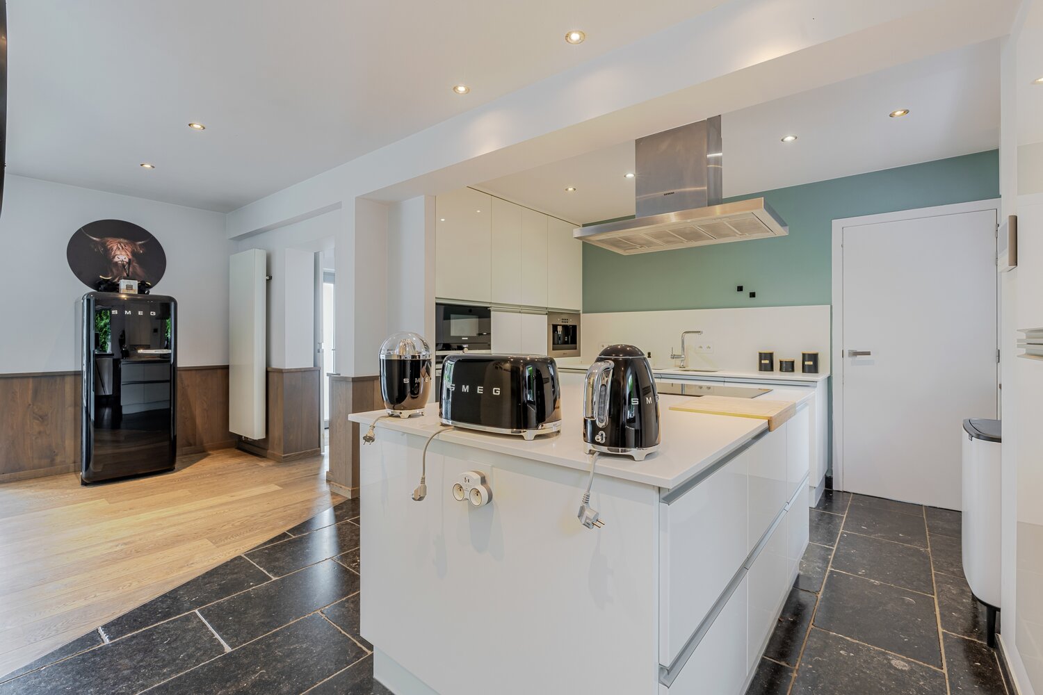 De leefruimte is lichtrijk en ruim, met salon, eetplaats en volledig uitgeruste keuken.