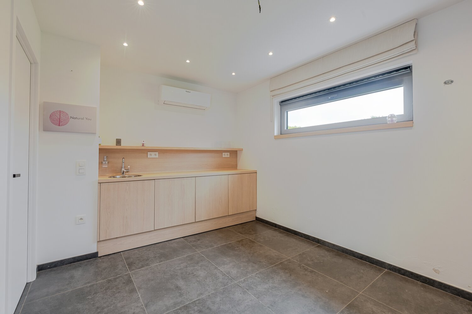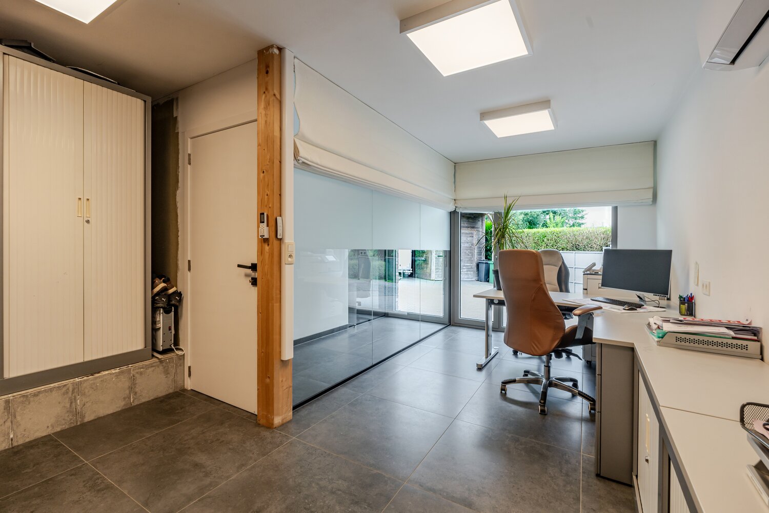 De gelijkvloerse polyvalente ruimtes zijn vandaag ingericht als schoonheidssalon en als bureauruimte. Deze bieden uitstekende mogelijkheden voor een praktijk, kantoor of vrij beroep aan huis. Dankzij de zichtbaarheid vanaf de Brusselsesteenweg én de ruime parkeergelegenheid is dit een droom voor wie werk en wonen wil combineren.