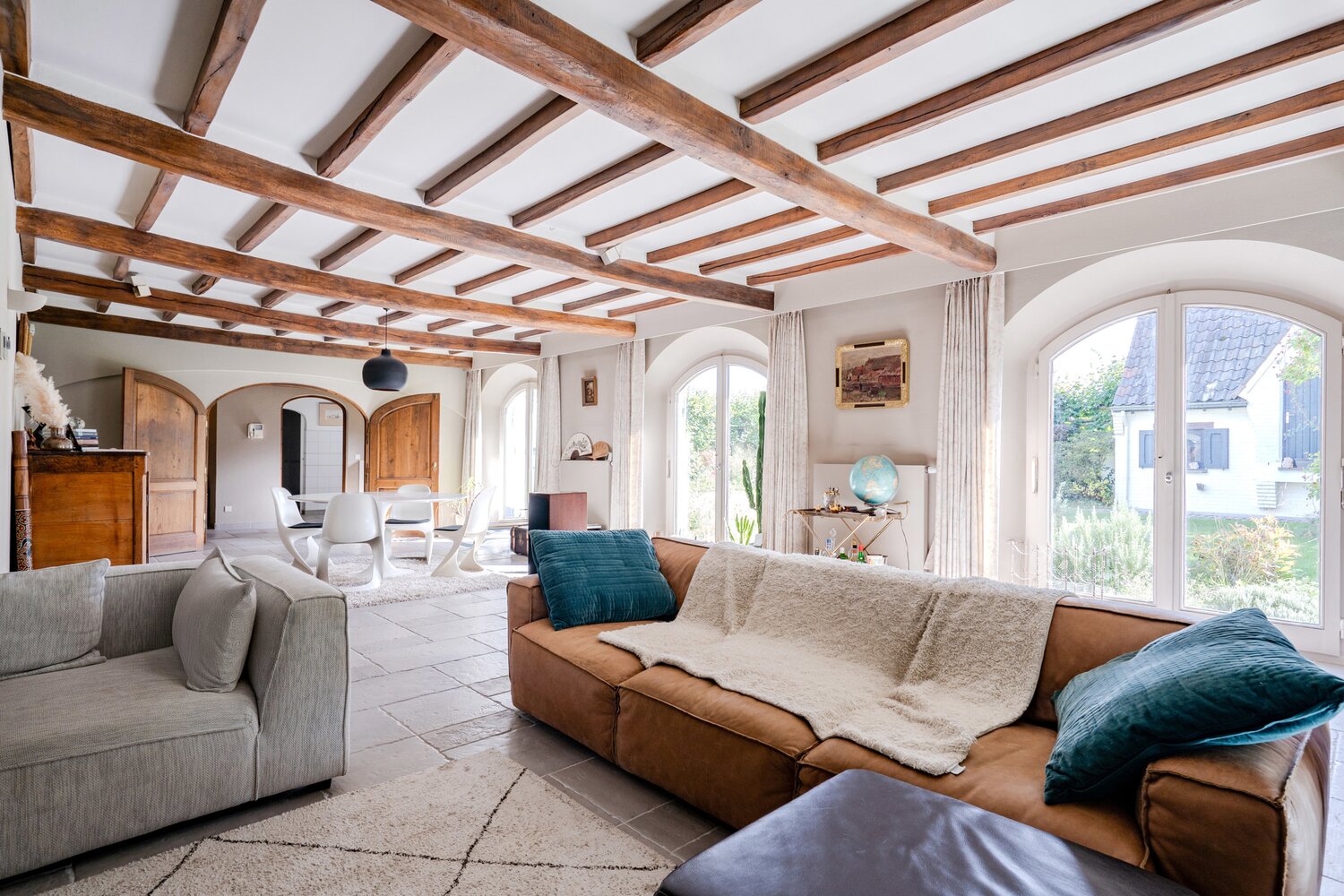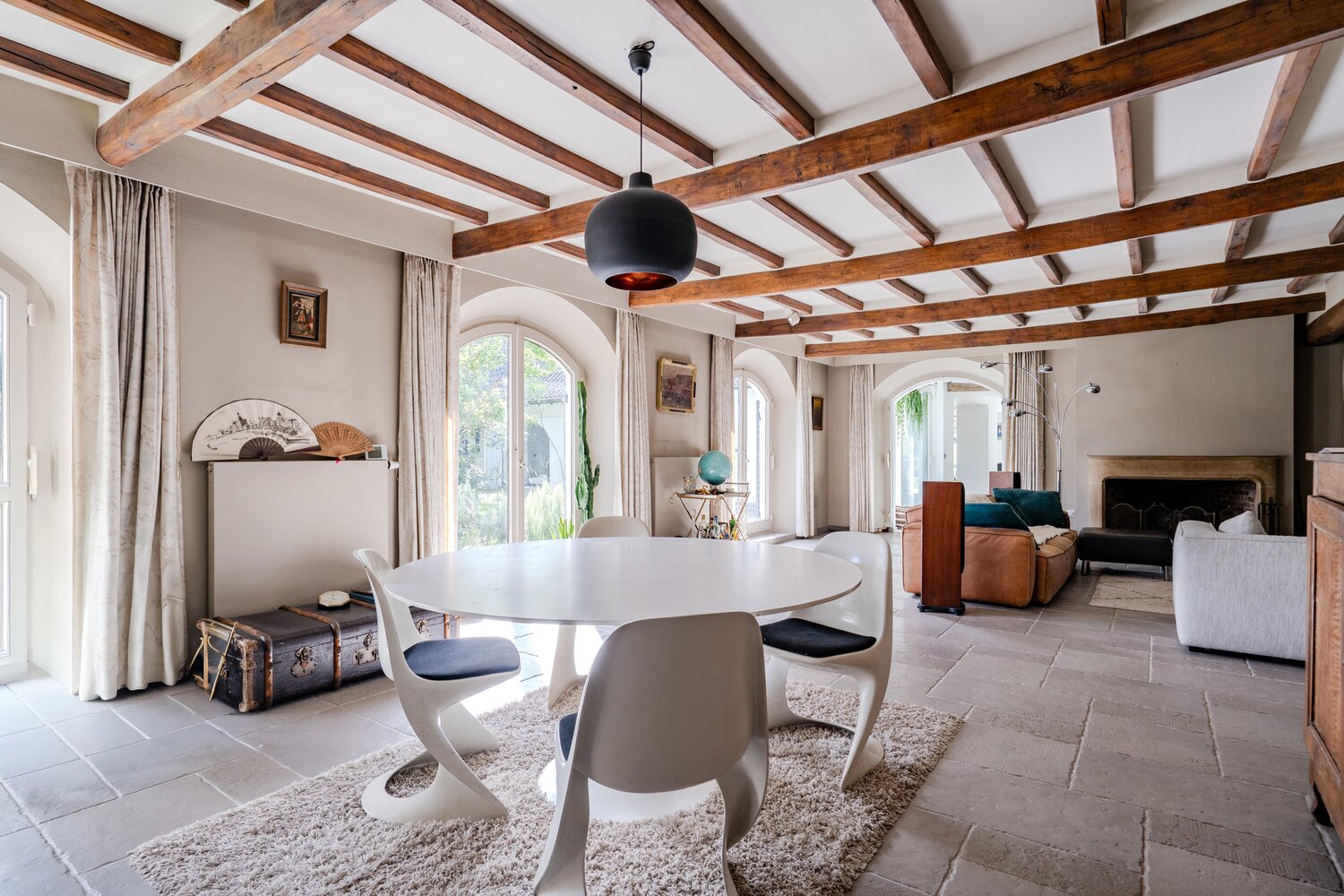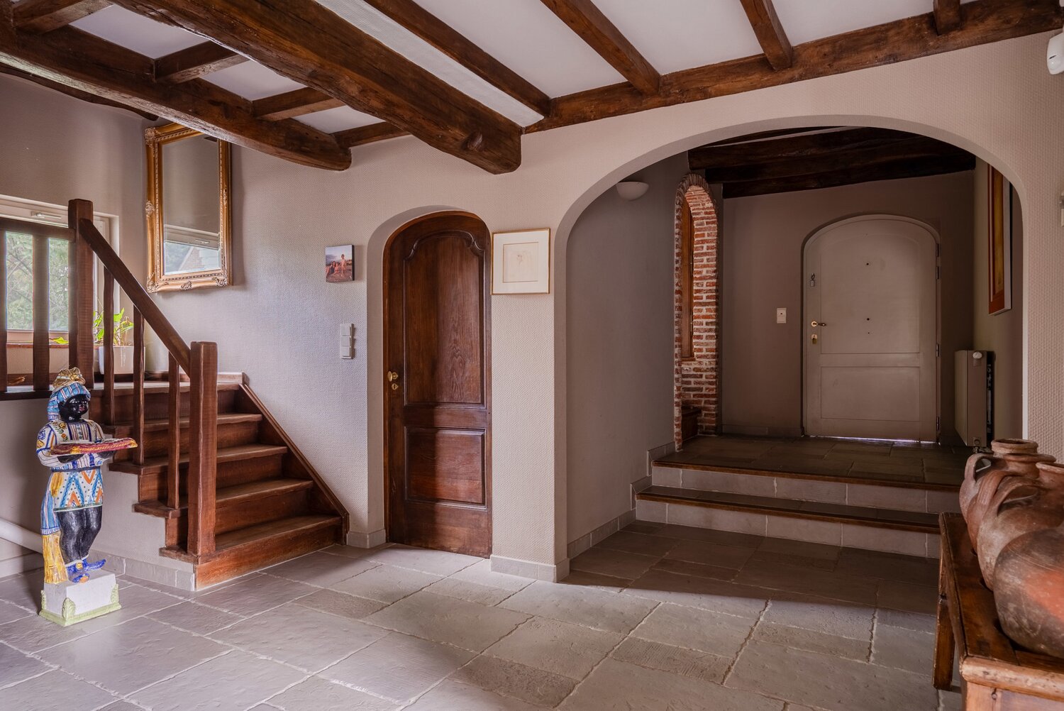 L'entrée de la villa se trouve parallèlement à la rue. Vous entrez dans la villa par le hall d'entrée spacieux avec toilettes pour invités, puis vous accédez à la première partie de la maison. Les sols, les poutres et la cheminée authentiques caractérisent les pièces confortables telles que la salle à manger et le salon.