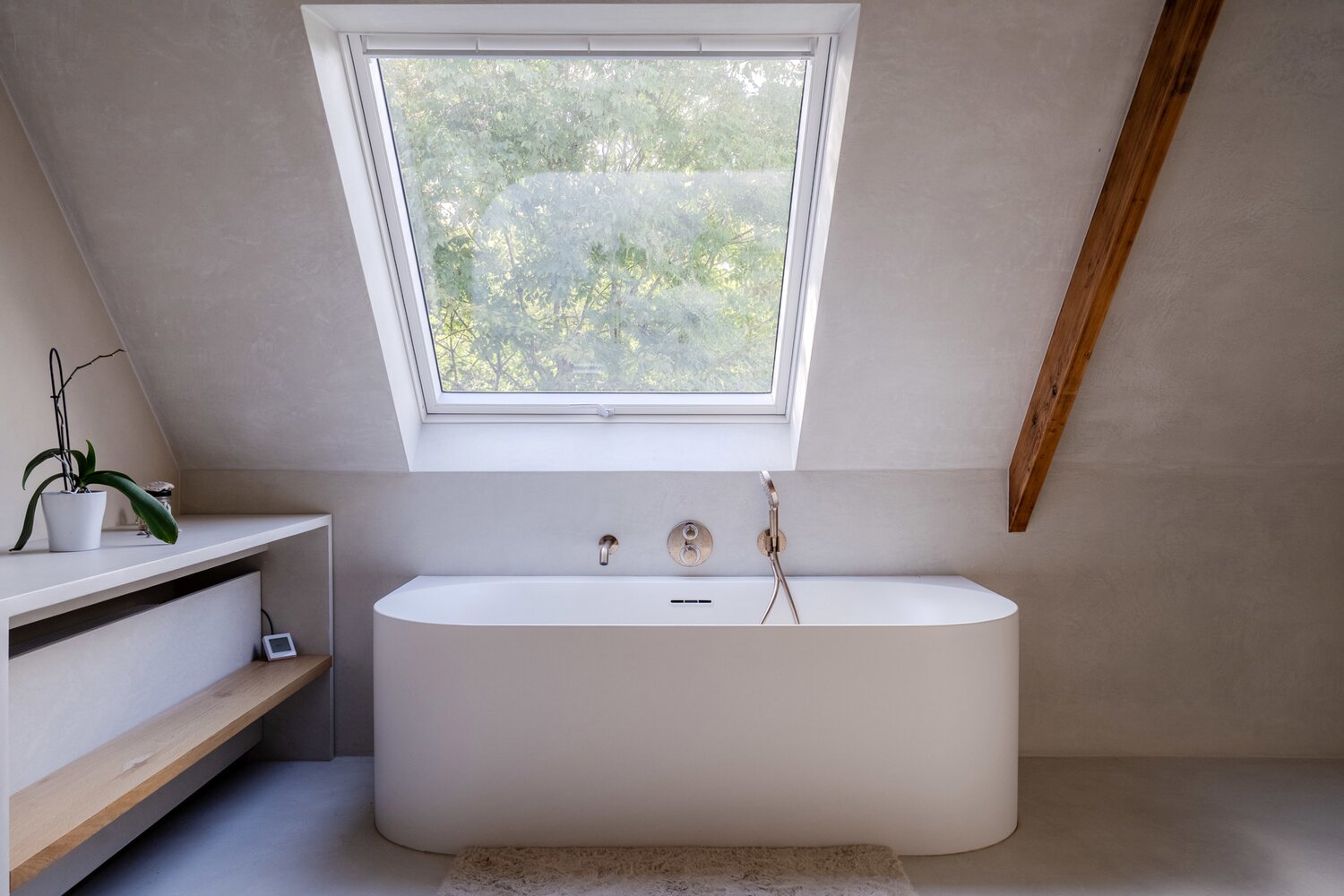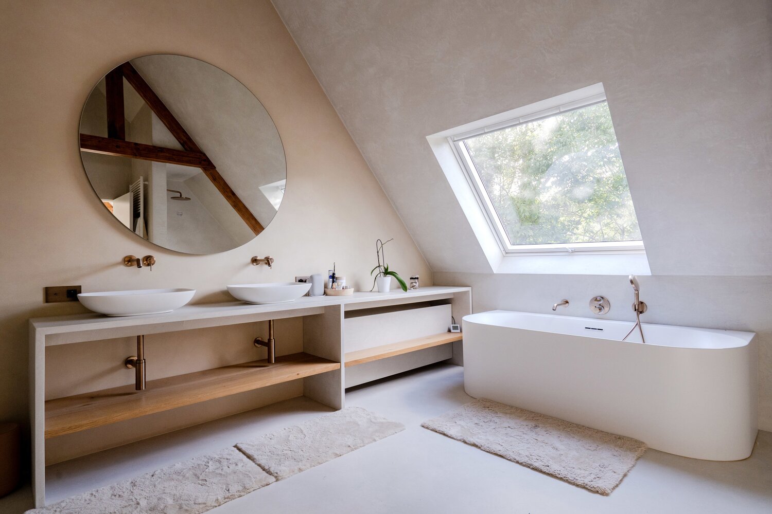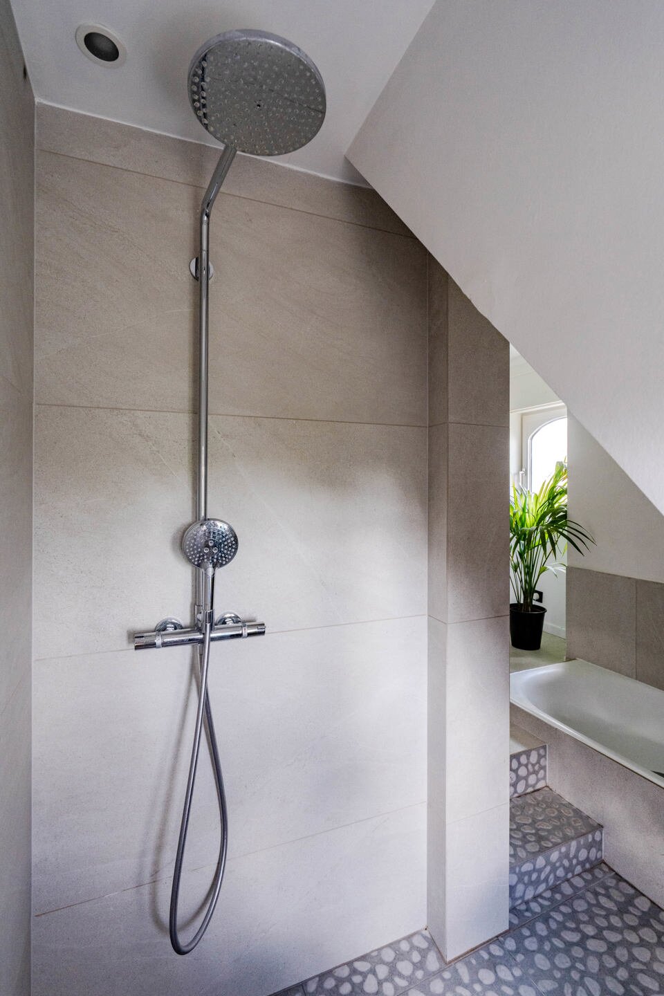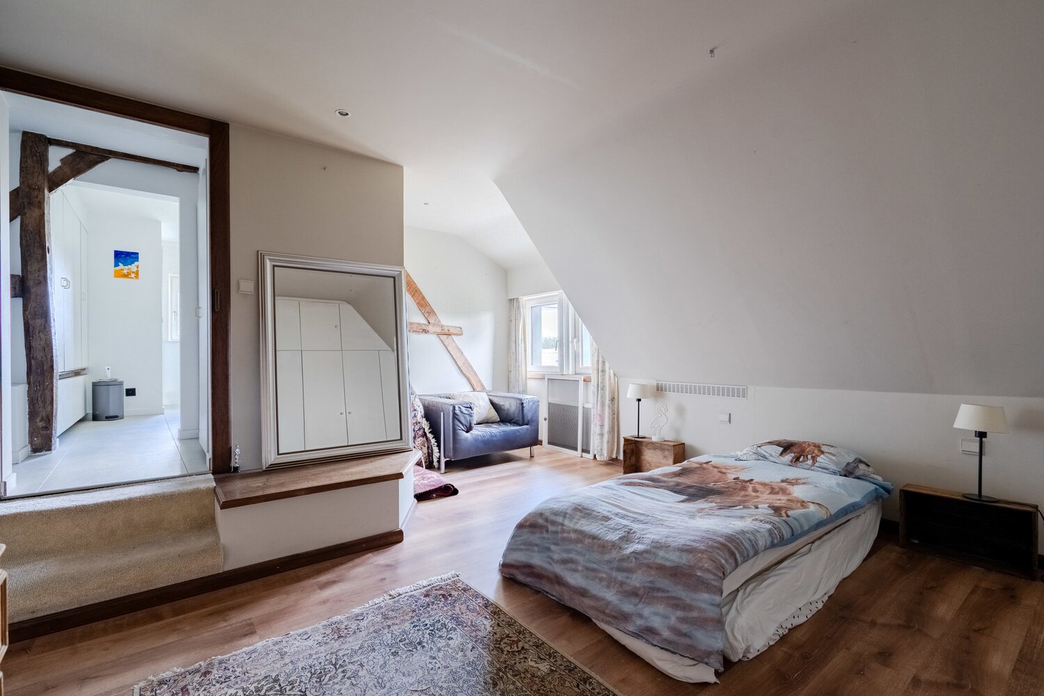 L'entrée de la villa se trouve parallèlement à la rue. Vous entrez dans la villa par le hall d'entrée spacieux avec toilettes pour invités, puis vous accédez à la première partie de la maison. Les sols, les poutres et la cheminée authentiques caractérisent les pièces confortables telles que la salle à manger et le salon.