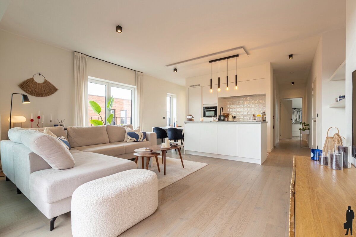 Dit prachtige appartement is gelegen op de 3e verdieping en is bereikbaar via zowel trap als lift. Via de inkomhal bereikt u de lichte en ruime leefruimte met open keuken. De keuken is volledig uitgerust, waaronder een ijskast/vriezer, combi-oven, een inductiekookplaat en een vaatwasser, evenals voldoende kastruimte. Naast de keuken bevindt zich een ruime berging/technische ruimte met plaats voor opslag, wasmachine en droogkast.