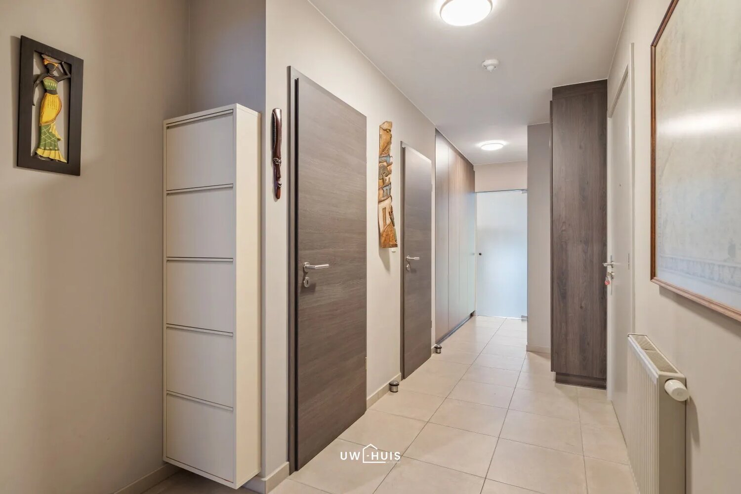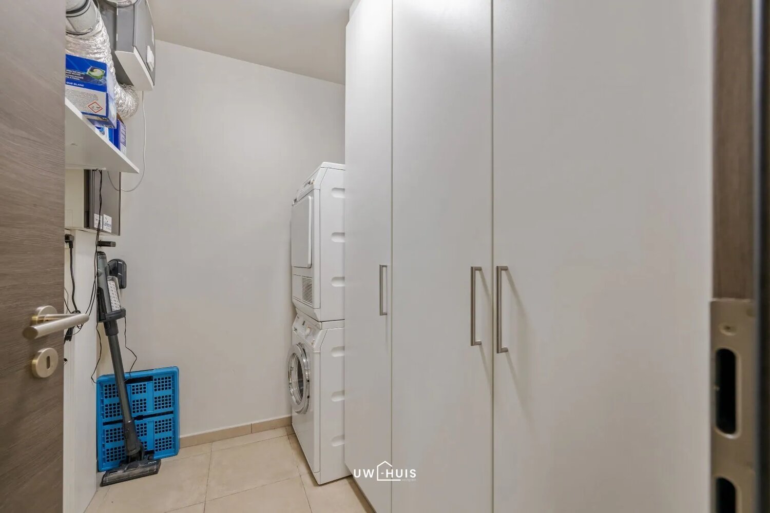 Je komt binnen in een ruime inkomhal met ingemaakte kasten, wat meteen zorgt voor een nette en georganiseerde eerste indruk. Vanuit de hal bereik je de lichtrijke leefruimte met grote ramen, een ruime zithoek, eetplaats en een open keuken die volledig uitgerust is met alle toestellen. Achter de keuken bevindt zich een handige berging met aansluiting voor wasmachine en extra opbergruimte.